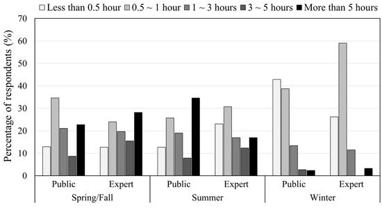 Figure 13 shows the survey response results for the daily total ventilation time according to the season. Respondents were asked to select the total amount of time that they performed natural ventilation by opening windows, operating the heat recovery ventilator, and operating the kitchen and bathroom exhaust fans. Overall, the ventilation time in winter was lowest in both groups; in particular, the proportion of short-term ventilation time of less than one hour was 81.5% (public) and 85.2% (experts) in winter, 47.5% (public) and 36.6% (experts) in spring/autumn, and 38.4% (public) and 53.8% (experts) during the summer. While the public have a longer ventilation time during summer days than in spring/autumn, the opposite is true for experts. The public ventilated for more than 5 h during summer (34.6%) than in spring/autumn (22.7%), but for experts, this was lower in summer (16.9%) than in spring/autumn (28.2%). This means that the public ventilate for a long time for heat comfort in summer. In the general population, there was no correlation between ventilation time and home residence time in spring/autumn and winter, but there was a correlation in summer (p < 0.05). On the other hand, no association between ventilation time and time spent in the house was found for experts.