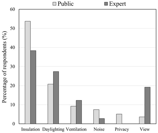 Figure 14 shows the response results of the public and experts regarding the main functions of windows. The public (54%) and experts (39%) chose insulation as the first major function; daylighting was second at 21% and 28%, respectively. The public chose ventilation (9.3%) as the third-most important function, while ventilation (12.3%) was the fourth-most important function for experts. Figure 15 shows the response results for the satisfaction of the public and experts for the top 4 items of the main functions of the window system. Daylighting had the highest satisfaction (satisfied and very satisfied) at 62.8% and 76.7% for the public and experts, respectively. However, 53.4% and 46.6% of the public and experts, respectively, found insulation to be less than satisfactory (neutral, dissatisfied, and very dissatisfied). The public showed the highest dissatisfaction with insulation at 19.3%, and the experts showed the highest dissatisfaction with ventilation at 26%. Both groups showed a strong correlation between the window installation period and satisfaction with insulation (p < 0.005). In addition, the public showed a strong correlation between the window installation period and satisfaction with daylighting (p < 0.005), whereas the expert showed no correlation (p > 0.05).