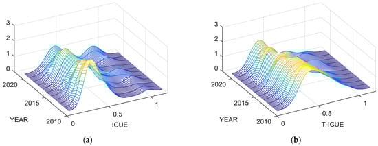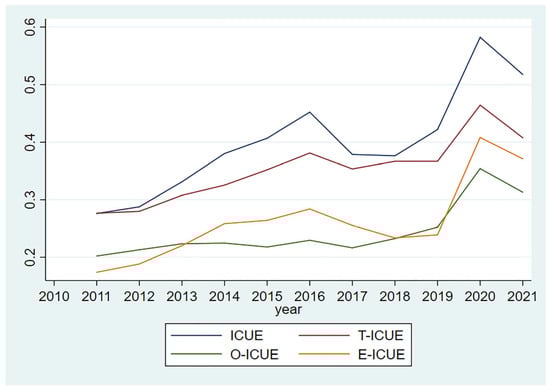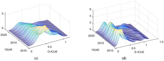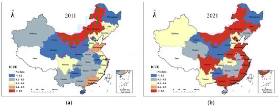 This index system involves more indicators, and potential correlations among technical indicators or environmental indicators could impact SBM results. To address this, the principal component analysis (PCA) using SPSS 25.0 software was conducted first on various inputs to reduce the dimensionality [86]. We obtained five new inputs. The advantages and results of the PCA method are shown in Appendix A. Then, the ICUEs were evaluated using the US-SBM model in MATLAB 2016a software with the five new inputs and two original outputs. To check the specific structures of provincial ICUE levels, we also measured the ICUE levels of the three systems using relevant inputs, namely, T-ICUE, O-ICUE, and E-ICUE.