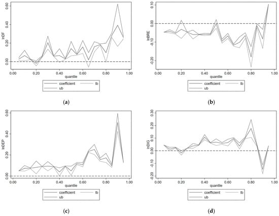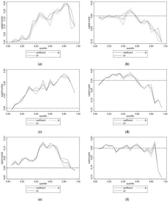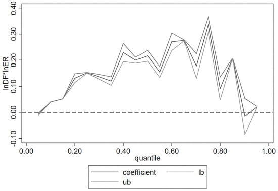 Considering our data characteristics, we conducted normal distribution tests, and then adopted the QRPD to further capture the asymmetric link between ICUE and drivers, that is, the dynamic evolution of the direct marginal influence of DF on ICUE and the moderating marginal influence of ER at different ICUE levels, as shown in Equations (4) and (5).
