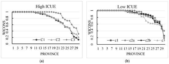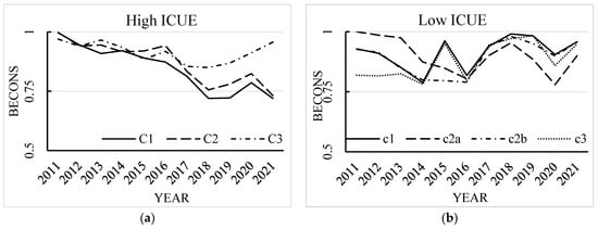 However, traditional fsQCA lags behind cross-sectional data. Drawing on Hong et al. [27], we extend traditional fsQCA to dynamic fsQCA for panel data, to explore the linkage effect of the DF and ER factors behind the differences in provincial ICUE from the spatial–temporal dimension. The relevant indices are shown in Equations (8)–(10).