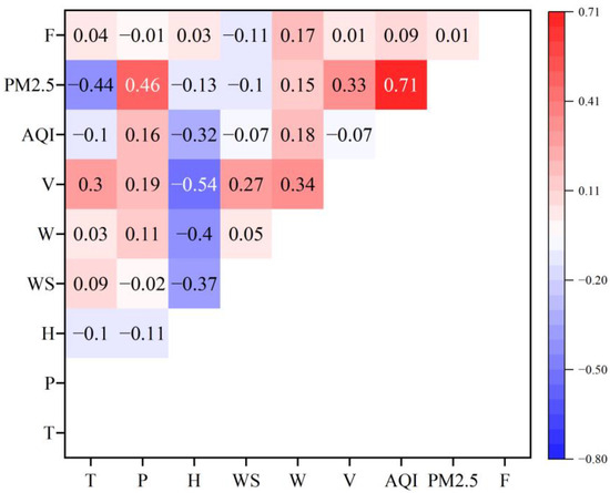 To avoid multicollinearity among characteristic variables of public bicycle-borrowing and -returning demands, the Pearson correlation coefficient is used to measure the correlation among bicycle use frequency, meteorological indicators, and air quality indicators (see Equation (1)).