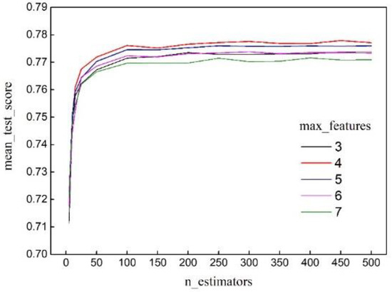 The random forest method can address both classification and regression problems, which primarily depend on whether each tree in the random forest is a classification tree or a regression tree. For regression trees, the principle employed is minimizing the mean squared error. Specifically, for any split feature T, given datasets and generated by any split point p, the final feature and feature value split point are determined to minimize the mean squared error of the collections in , and , while also minimizing the sum of the mean squared errors of and (see Equation (2)).