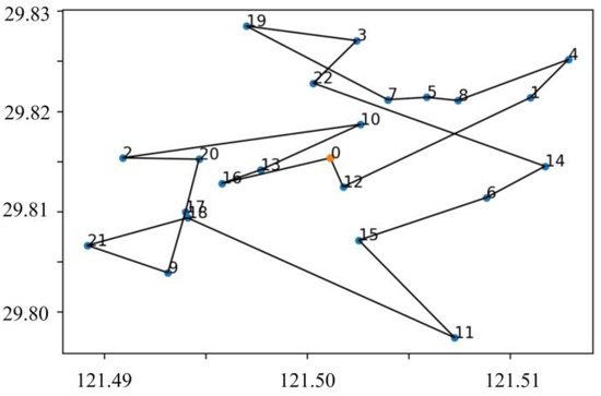 Then, the optimal rebalancing scheme based on the GA algorithm is shown Figure 7. The optimal rebalancing order is 0-12-1-4-8-5-7-19-3-22-14-6-15-11-18-21-9-17-20-2-10-13-16-0. The value of the purpose function is 1012.25. The working time of the dispatch vehicle is 1.36 h. Moreover, this study also solves the bike-sharing rebalancing problem with the Taboo search algorithm (TSA). The results of GA and TSA are shown in Table 11.
