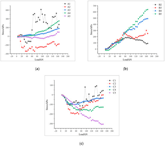 It can be seen from Figure 8a that the tap root of the living stump at the top of the slope was mainly subjected to compressive stress, and the compressive stress increased as the load increased. The compressive stress of measuring points 3, 4, 5 and 7 reached its peak at 120 kN, and then gradually decreased, which may be because the soil at the top of the slope had been damaged. Additionally, the increased load did not act on the root system. All the measuring points on the tap root of the living stump in the middle of the slope were subjected to tensile stress, and the tensile stress of measuring points 1 and 2 increased as the load increased. Except for measurement point 6, the other measuring points of the tap root of the living stump at the slope foot were mostly under tensile stress. Measuring points 3, 5 and 7 were all subjected to low tensile stress at 0–110 kN, and then the tensile stress increased rapidly with the increase in load. This may be because the soil at the slope had already started to slide, and the tap root system was exerting its tensile strength to prevent the soil from sliding further.