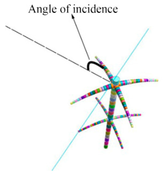 When rotating lateral roots, the first- and second-layer lateral roots are rotated around the tap root, which is the axis of rotation. The incident angle of the lateral root is defined as the angle between the lateral root and the normal line of the strike line of the slope foot, as shown in Figure 17.