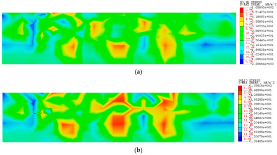 Soil shear stress in longitudinal section of slope toe: (a) lateral root incidence is 0°; (b) lateral root incidence is 40°.