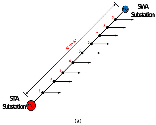 In this section, by assuming the critical load to be load 4, the DG system was placed at each position of 1/3, 1/2, and 2/3 between the substation and the critical load (Figure 8). Figure 8 shows that the distribution system has two substations. Therefore, the case study was divided into two parts: from the STA substation to the critical load and from the SWA substation to the critical load.