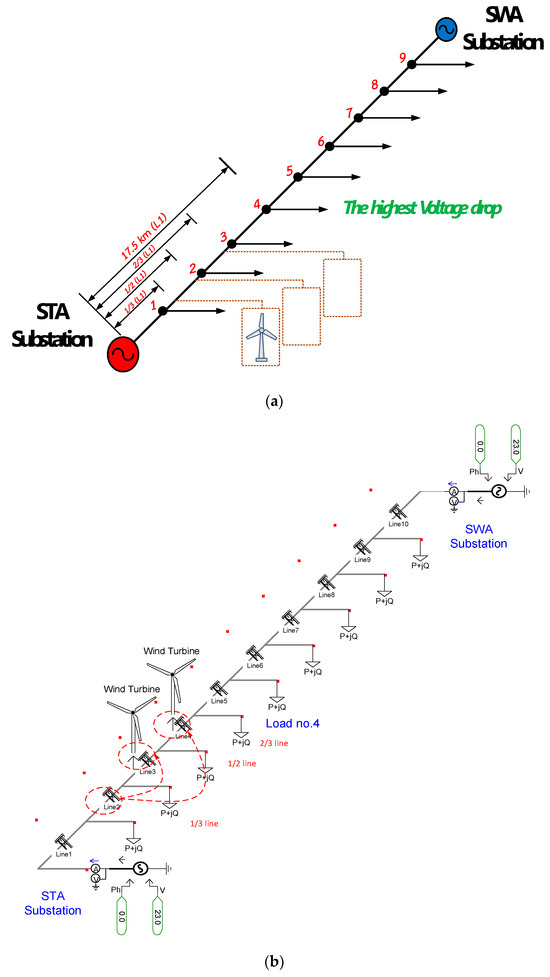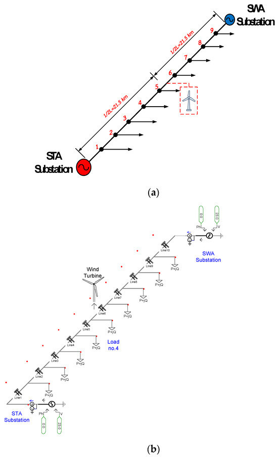 Various DG positions along the length of the distribution feeder. (a) Single-line diagram. (b) The PSCAD model.