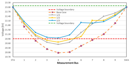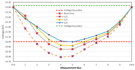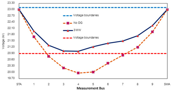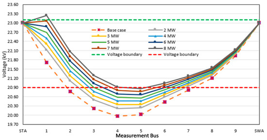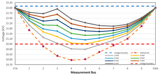 Furthermore, the obtained voltage result is shown in Table 10, and Figure 12 indicates the 2/3 placement between the STA substation and the critical load, which shows that the critical load voltage follows the PEA standard when applying the DG at a capacity of 4 MW can improve the voltage level at all loads. By comparing the DG capacity, the capacity is derived if the DG placement moves close to the critical load location according to the 1/3, 1/2, and 2/3 placements.