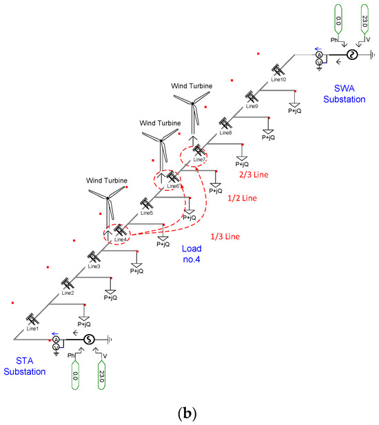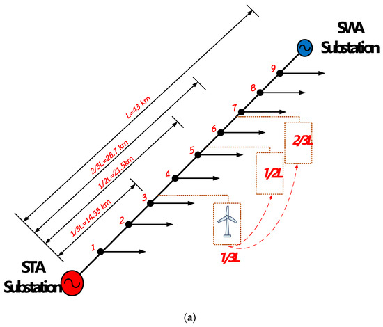 In the previous section, we described the effect of DG when placed between the STA substation and the critical load. In this section, we investigated the effect of DG when placed between the SWA substation and the critical load. Cases 1/3, 1/2, and 2/3 were located 8.5, 12.5, and 17 km from the SWA substation, respectively, as shown in Figure 13.