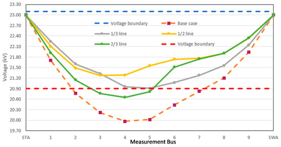 The voltage results of 3 MV DG placement between the SWA and the critical load and those without DG placement were compared; the results are presented in Table 11. The results indicated that only the voltage level obtained in the case of the 2/3 placement from the SWA substation was within the PEA standard. In addition, when compared with the 2/3 DG placement on the STA substation side (Table 7), we observed that the DG in the case of the 2/3 placement from the STA substation was located closer to the critical load than that in the case of the 2/3 placement from the SWA substation; however, the voltage level at load 5 was still lower than the voltage threshold. This characteristic indicates that the load density may affect voltage improvement because the STA side has a higher load density than the SWA side. When considering the other two cases, the voltage level of loads 3–5 in the case of 1/2 DG placement was higher than that in the case of the 1/3 DG placement; however, in both cases, the voltage level was still lower than the PEA standard, as shown in Figure 14. This demonstrates that the load density as well as the distance between the DG and the critical load play an important role in voltage improvement.