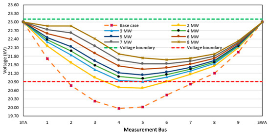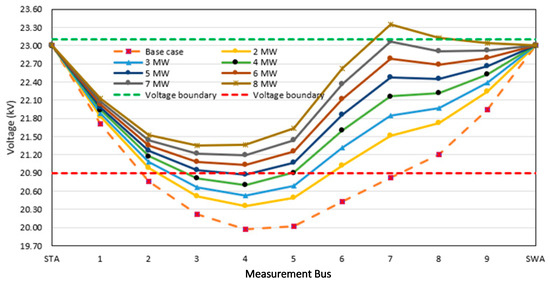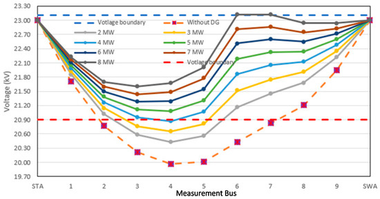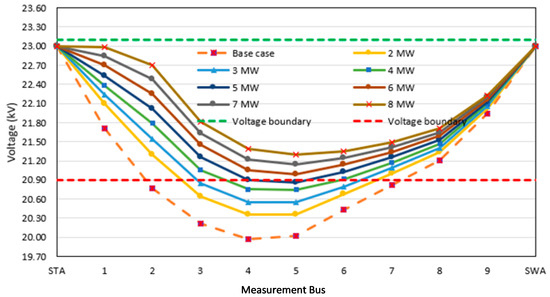 Next, the DG capacity was varied between 2 and 8 MW at the 1/2 placement between the STA substation and the critical load (Table 9 and Figure 11). In the case where the critical voltage level reached the PEA standard at a 6 MW capacity, the voltage level can be improved by using other loads. Similarly, the voltage level at the critical load was higher than that in the case of the 3 MW DG system at the 2/3 placement along the distribution line because the DG capacity directly impacts the voltage level at all loads. However, by comparing the voltage level in the case of the 8 MW DG system at the 1/3 placement between the STA substation and the critical load, we found that the voltage level in the case of the 8 MW DG system was better than that in the case of the DG system at all other loads.