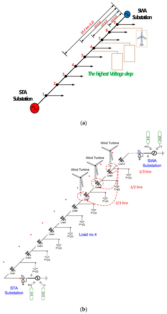 Based on the above discussion, we infer that voltage improvement depends on the DG placement location by considering the load with the lowest voltage level as the terminal of the line. The distances for DG placement, namely 1/2, 1/3, and 2/3, were reconsidered based on the distance from the substation to the critical load, which is discussed in the next section.
