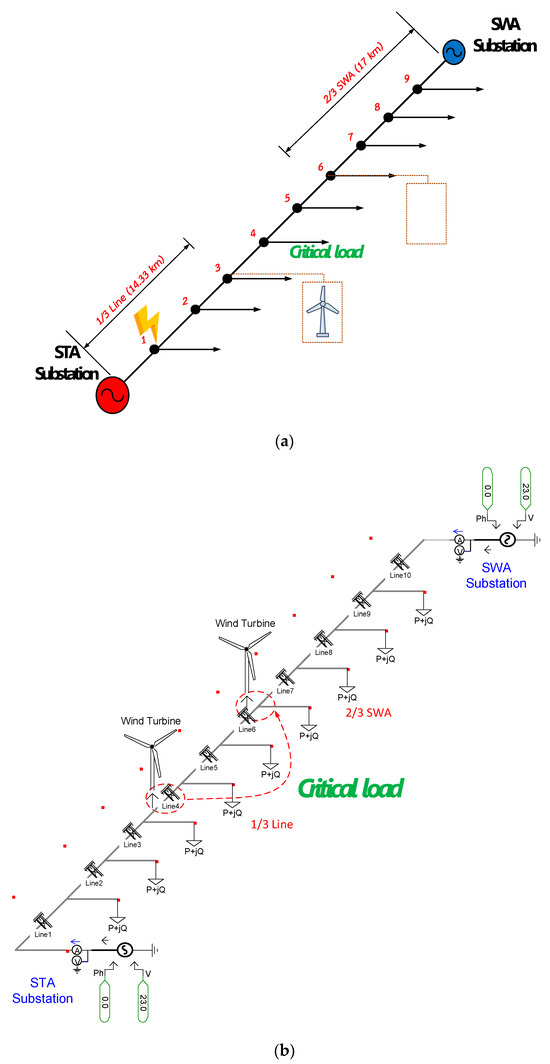 Various DG placements between the SWA substation and the critical load. (a) Single-line diagram. (b) PSCAD model.