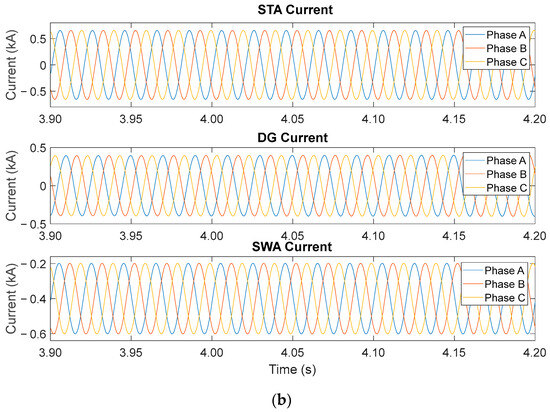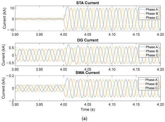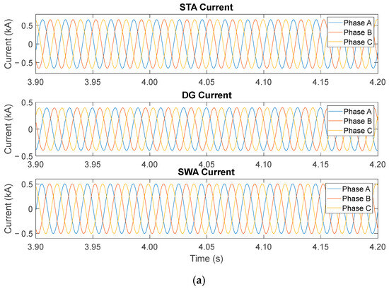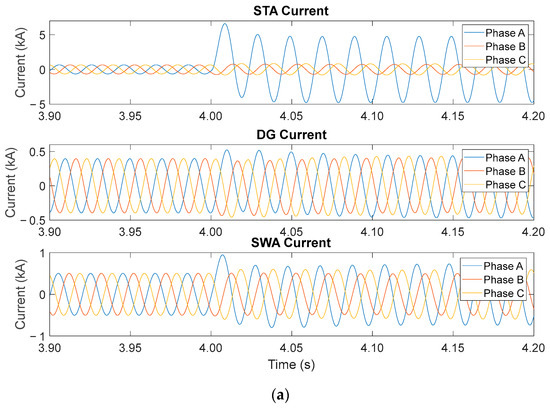 In the case of 1/3 placement along the distribution line (Table 15), a similar trend was observed in the current characteristics, wherein the current level on each load increased and that on the STA substation significantly decreased as the fault location moved away, from L1 to L6. However, compared with that observed in the case of the 2/3 placement, a slight difference in the current level was noted in the case of the 1/3 placement owing to the location of the DG system. In the 1/3 case, the DG was located on the substation side of the STA. Thus, the current from the DG flowed to the fault location instead of flowing from the substation and the load resulted in a slight decrease in the STA substation current and an increase in the current load. However, in the case of the 2/3 placement from the SWA substation, the DG system was located at the other end of the distribution line near the SWA substation. Therefore, the current flowed from the DG to the fault location when the fault location moved near the SWA substation, resulting in a reduction in the substation current.