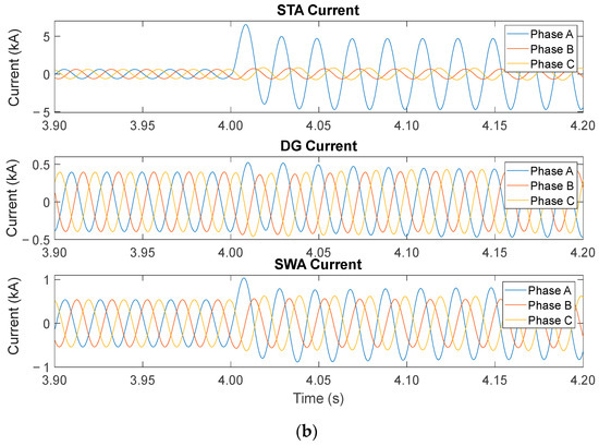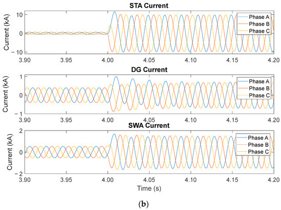 Current waveform in the case where the three-phase fault occurs at 5.5 km from the STA substation. (a) The 2/3 placement from the SWA substation. (b) The 1/3 placement along the distribution line.