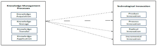 An extensive strand in the literature examines the influence of different knowledge management processes on various types of innovation. According to Marvel [58] and Molina-Morales et al. [59], knowledge acquisition directly enhances new product development and significantly improves existing services while knowledge application facilitates practical implementation in product development. This leads to innovative products that meet new market demands or enhance the user experience. Furthermore, knowledge storage enables organizations to optimize, increasing efficiency and reducing costs [60,61]. On the other hand, knowledge transfer across departments can uncover more efficient production techniques or distribution methods, enhancing overall process innovation.