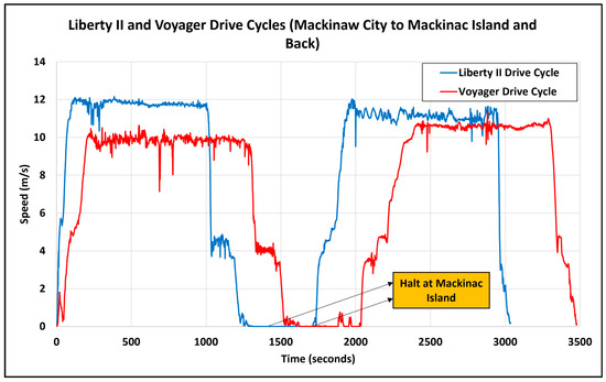 Travel from Mackinaw City to Mackinac Island and back is approximately a 25 km (15.6 mile) route. The logged drive cycle starts from Mackinaw City, docks at Mackinac Island, and then returns to the mainland. The speed vs. time data for this drive cycle for the Voyager and the Liberty II (names changed for anonymity purposes), which are two of the ferries in the ferry company’s fleet, are shown below in Figure 5. The two ferries are similar in length and passenger capacity. For all parts of the drive cycle, the fuel flow rate displayed on the captain’s control panel was noted.