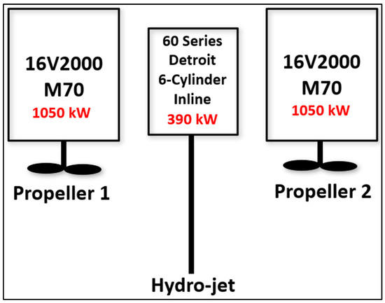The drive cycle data sheds light on the fact that the Voyager cannot cruise as fast as the Liberty II even with an additional engine, because of the deterioration of its engines. Hence, while determining the total fuel and energy consumption for a drive cycle, the Liberty II data were used. The engines used in the Liberty II are shown in Figure 6. This is the proposed configuration for the Voyager if it is to be rebuilt with new engines.