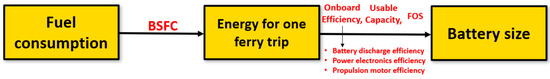 The BSFC data of the hydro-jet engine were unavailable. An assumption was made about the hydro-jet engine having similar efficiency numbers as the propulsion engines, as it was run at a similar speed and load condition. A schematic of the process of battery sizing is shown in Figure 7.