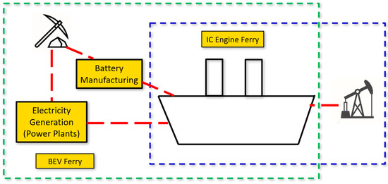 - Emissions from the burning of fuel at the power plants (coal and natural gas power plants) using the energy mix in the geographical region that the ferry is operated [13].