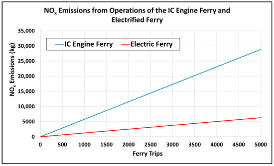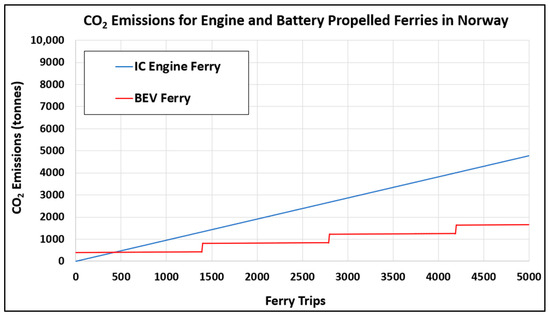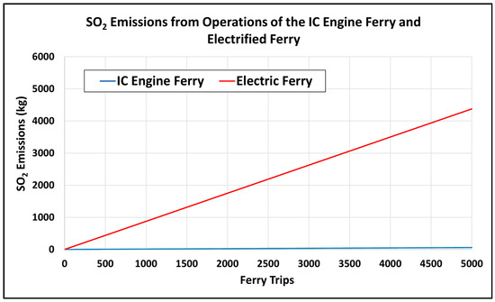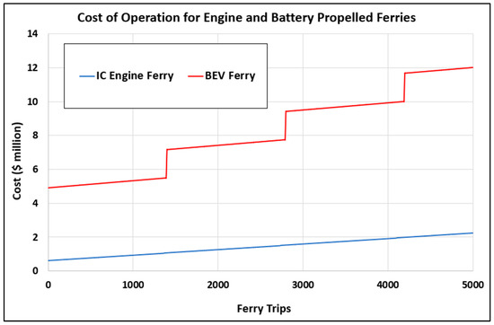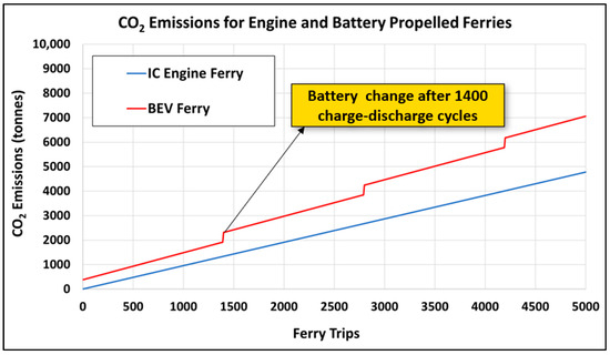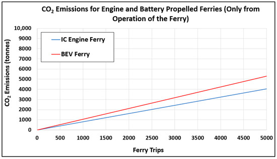 The estimated CO2 emissions for the two ferry configurations as a function of the number of ferry trips are shown in Figure 9. (The emissions in the manufacturing of Li-ion batteries are CO2-eq emissions, whereas emissions from all other sources used in the analysis are CO2 emissions.) When comparing the emissions for an IC engine ferry with a fully electric ferry running from Mackinaw City to Mackinac Island, the BEV ferry has higher emissions on a per trip basis. The reason for this is the mix of energy generation in Michigan, which includes carbon-based fuels, primarily natural gas and coal. The energy generation for the BEV takes place a long way away from the ferry, and by the time it is used to propel the ferry, it has undergone multiple losses, which compound the CO2 emissions. In the case of the IC engine ferry, the combustion occurs on the ferry itself and the energy is put to use for propulsion right away. Over 5000 ferry trips, which is approximately 3.5 seasons, the BEV configuration will have 48% higher CO2 emissions than the IC engine configuration.