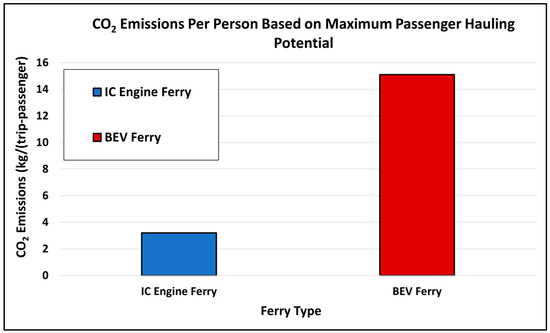 An argument can be made that if the chosen efficiency values are lower than what is possible with today’s technology, the analysis might yield different results. To cover all bases, the CO2 emissions for the fully electric ferry were calculated with all three of the efficiencies in question assumed to be 100%. The results are shown in Figure A2.