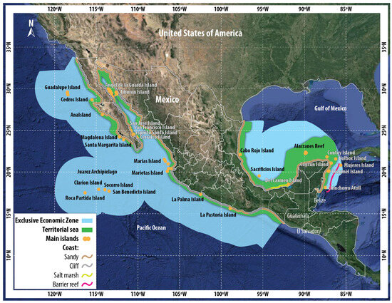 Continental shelf, territorial sea, and exclusive economic zone of Mexico with the main island areas.