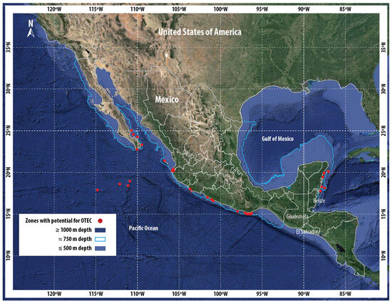 Potential sites for the implementation of the Ocean Thermal Energy Conversion (OTEC) system in Mexico.