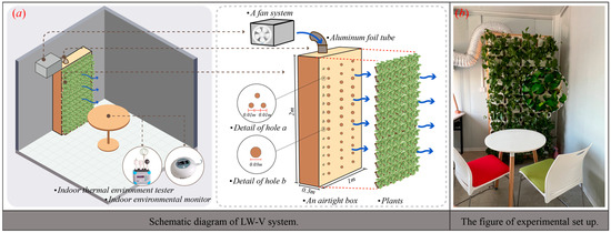An automatic watering device regulated the soil moisture level between 30% and 50%, ensuring optimal conditions for natural plant growth and room comfort. The study by Ding et al. [35] showed that Epipremnum aureum were the most suitable plants to be grown indoors, either under sufficient or insufficient light conditions. In this study, a total of 104 pots of Epipremnum aureum with an average height of about 25 cm were used to ensure their proper distribution and layout on vertical walls. In addition, the fan system passed through the aluminum foil tube, the airtight box, and the surface of plants, and then sent the air out. Because of the repair and transpiration of plants, it can play a role in filtering and improving the indoor thermal environment.