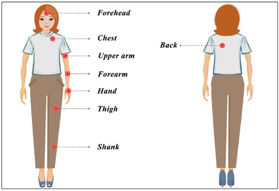 During the experiment, the subjects’ subjective feelings on the indoor environment were recorded through a questionnaire survey. Meanwhile, the skin temperature was monitored by a skin temperature monitor on eight body parts, namely, forehead, chest, back, upper arm, forearm, hand, thigh, and shank. The time interval of the instrument for recording data was set to 5 s/time. The schematic distribution of human skin temperature measurement points is shown in Figure 3. During the experiment, breathable medical tape was used to attach the body surface temperature probe to the surface of human skin, which helped avoid local discomfort of the skin due to the adhesive tape, and also strengthened the contact between the temperature probe and the skin to avoid the situation of the probe falling off. Table 1 shows the measuring range and accuracy of the instrument used in this experiment.