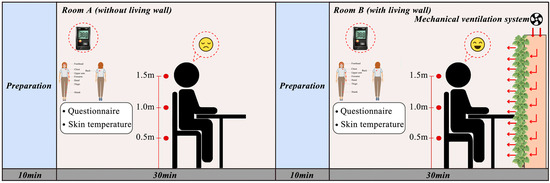 - Before the survey, the subjects were required to arrive at the experimental site in advance and spend 10 min outdoors for relaxation. During this time, the subjects received a comprehensive introduction to the experimental process and related precautions, completed basic personal information forms, and then underwent random assignment to either Room A or Room B.