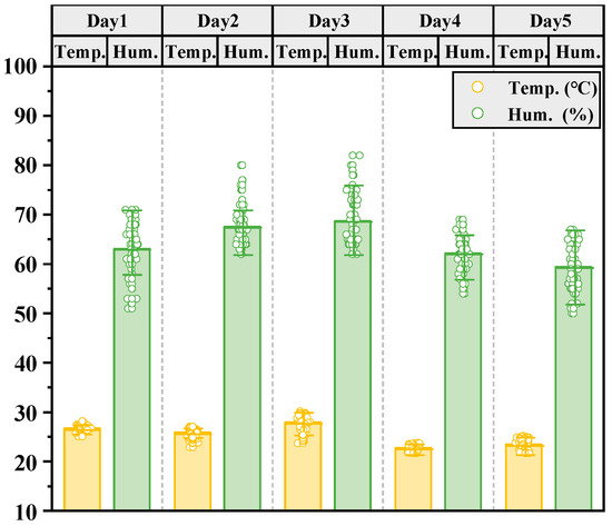 To investigate the effect of the LW-V system on the indoor thermal environment, the indoor air temperature, relative humidity, air speed, and CO2 concentration were monitored during the mechanical ventilation process in the transition. As a reference, Figure 6 displays the temperature and relative humidity of weather station data for the corresponding five days. The weather station is located in the experimental area near the laboratory.