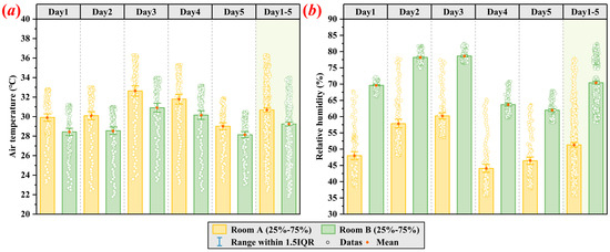 Comparison of (a) indoor temperatures and (b) relative humidity in Room A and Room B.