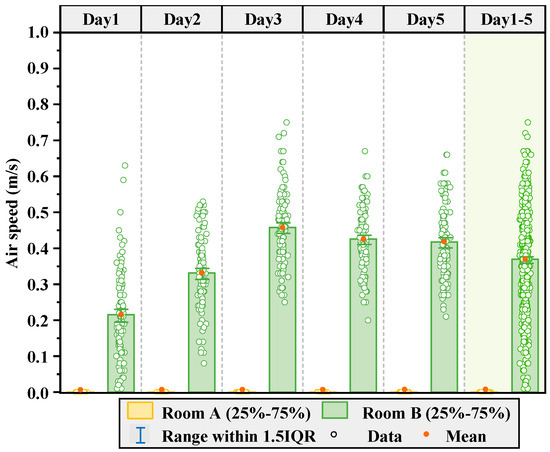 In addition to indoor temperature and relative humidity, indoor air speed is also one of the factors affecting indoor thermal comfort. Figure 8 compares the indoor air speed of Room A and Room B during the experiment. It can be seen from the figure that there was no fresh air volume in Room A, while the air speed in Room B was maintained at 0.2–0.65 m/s. The average air speed in Room B was 0.37 m/s. This is due to mechanical ventilation, which speeds up the indoor air flow. Proper airflow can play a role in accelerating the indoor air circulation and renewing the indoor air, thus creating a more comfortable indoor environment.