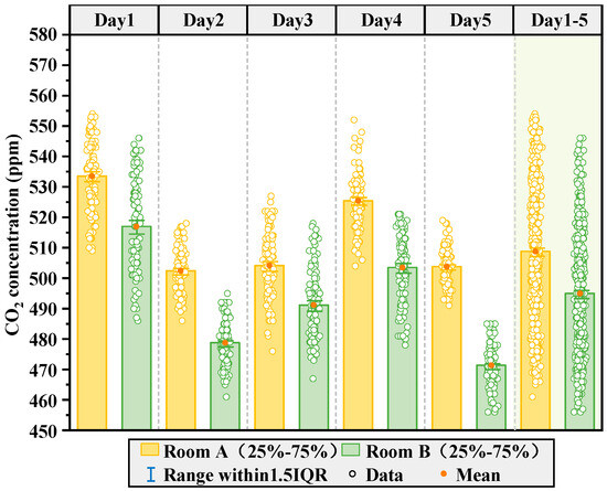CO2 concentration level is an important indicator of indoor air quality, and a high CO2 concentration can affect the occurrence of sick building syndrome, thus affecting people’s health. An LW-V system can absorb CO2 and release O2 from the photosynthesis of plants and play a role in renewing indoor air. Figure 9 compares the indoor CO2 concentration in Room A and Room B during the experiment. As shown, the CO2 concentration in Room A was maintained between 465.09 ppm and 555.32 ppm, with an average CO2 concentration of 508.81 ppm. The CO2 concentration in Room B was maintained between 455.23 ppm and 545.12 ppm, with an average CO2 concentration of 494.98 ppm. The average CO2 in Room B was 13.83 ppm lower than the average CO2 concentration in Room A. This is because the plants in Room A photosynthesized and absorbed CO2 from the room. The photosynthetic efficiency of plants is related to the indoor CO2 concentration. In a real indoor space, human respiration leads to an increase in CO2 levels. Therefore, it can be inferred that the CO2 absorption rate of the LW-V system would be elevated, which shows that Room B had the potential to effectively enhance and improve indoor air quality through plant-mediated photosynthetic processes.