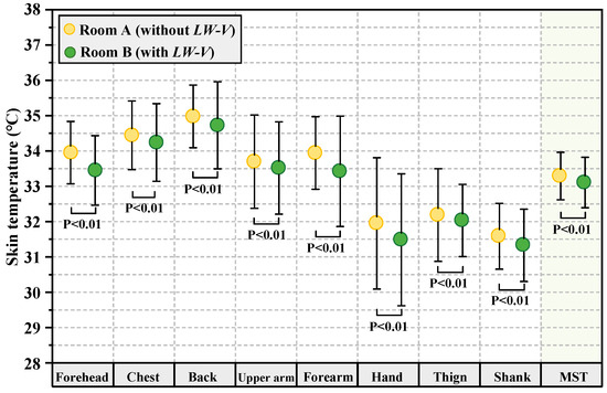 Calculated by the formula, the MST of the subjects in Room A was 33.31 °C, and that of the subjects in Room B was 33.13 °C. That of the subjects in Room B was 0.18 °C lower than that in the subjects in Room A, as shown in Figure 10. The experimental results show that the MST of the subjects in Room B was closer to the neutral MST of 33.2 °C. A clear linear correlation exists between skin temperature and thermal sensation, with the term “neutral skin temperature” referring to the specific skin temperature at which thermal sensation is perceived as neutral [38]. The experimental results demonstrate that the LW-V system effectively regulated the thermal comfort of the room during the transitional season.