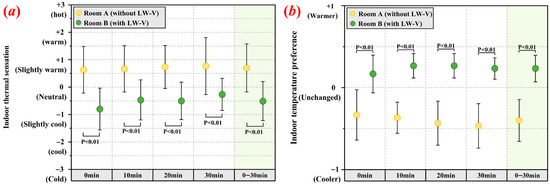 A questionnaire survey can directly reflect individuals’ responsiveness to the environment and can reflect individual needs. Figure 11 compares the subjective voting on indoor thermal sensation and thermal preference in Room A and Room B. As shown, the thermal sensation and thermal preference voting results of the two rooms were quite different. The overall thermal sensation vote for Room A was 0.7, which was close to “Slightly warm (+1)”. The voting gradually deviated from “Neutral (0)” and moved closer to “Slightly warm (+1)” as the duration of time the subjects spent inside the room increased. The overall thermal sensation of Room B was −0.51, which was between “Neutral (0)” and “Slightly cool (−1)”. With the passage of time during the experiment, the voting result was gradually closer to “Neutral (0)”. In comparison, Room B exhibited a more favorable trend in thermal sensation rating, which shows that the LW-V system had the potential to improve the room temperature. From the temperature preference, the overall voting result of Room B was −0.4, which was between ‘‘Unchanged (0)” and “Cooler (−1)”, while the overall voting result for temperature preference of Room A was 0.23, which was between “Unchanged (0)” and “Warmer (+1)”. This indicates that the temperature of Room B was more satisfying to the subjects, which is consistent with the indoor thermal sensation of the subjects in Figure 11a.