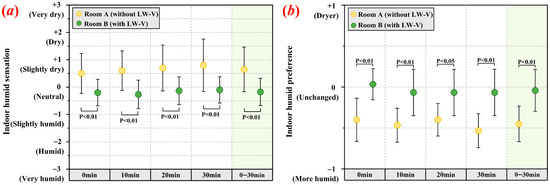 Figure 12 compares the subjects’ vote on the indoor humid sensation and indoor humidity preference in Room A and Room B during the transitional season. As shown, the humid sensation and humidity preference voting results of the two rooms were quite different. For indoor humid sensation, the overall humid sensation vote of Room A was 0.65, which was close to “Slightly dry (+1)”. The overall humid sensation vote in Room B was −0.18, which was close to “Neutral (0)”. With the passage of time during the experiment, Room B’s voting result was gradually closer to “Neutral (0)”. The subjects of the humid sensation evaluation in Room B rated the humidity as significantly higher than the subjects in Room A, which is consistent with the results of the test of the indoor relative humidity in Figure 7b, thus indicating that the LW-V system had the potential to enhance indoor relative humidity. For indoor humidity preference, the overall vote in Room A was −0.45, which was between “Unchanged (0)” and “Humid (−1)”. The overall vote for humidity preference in Room B was −0.04, which was close to “Unchanged (0)”, and as the length of time subjects stay in the room increased, the voting score was always close to “Unchanged (0)”. According to the voting results, the humidity level of Room B was more popular and better met people’s demand for humidity, which reflects the positive adjustment effect of the LW-V system on indoor humidity.