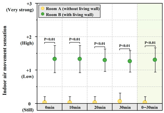 Figure 15 compares the indoor thermal comfort vote of the subjects in Room A and Room B. As shown, the thermal comfort vote for Room B was significantly higher than that for Room A, and there was a significant difference in comfort after 20 min. The overall thermal comfort vote for Room A was −0.23, which was in the range between “Neutral (0)” and “Slightly uncomfortable (−1)”, while the overall thermal comfort vote for Room B was 0.3, which was in the range between “Neutral (0)” and “Slightly comfortable (+1)”. With the passage of time during the experiment, the LW-V system was able to increase the comfort rating in Room B from 0.13 (closed to “Neutral (0)”) to 0.5 (between “Neutral (0)” and “Slightly comfortable (+1)”). In addition, there was a significant difference in indoor thermal comfort level after only 20 min. The combination of Figure 11 and Figure 12 shows that the LW-V system effectively improved the indoor thermal and humidity environment during the transition season through the transpiration of plants, thereby increasing the comfort level of the subjects.