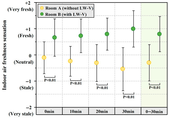 Figure 14 compares the subjects’ vote on air freshness in Room A and Room B. As shown, the voting result for Room A was −0.29, which was between “Neutral (0)” and “Stale fresh (−1)”. During the experimental period, the voting result decreased from −0.1 (close to “Neutral (0)”) to −0.53 (between “Neutral (0)” and “Stale fresh (−1)”). The voting result for Room B was 0.8, close to “Fresh (+1)”. The evaluation result of the subjects in Room B was obviously higher than that of the subjects in Room A, which indicates that the LW-V system had the effect of repairing and purifying the indoor air, as well as an effect on human psychology, thus improving the experience of the subjects.