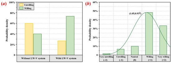 Figure 16 compares the voting results of the subjects’ willingness to stay in Room A and Room B for a long time and their willingness to introduce the LW-V system into the room during the transition season. As shown, 60% of subjects in Room A said they were not willing to accept it, and 40% of subjects were willing to accept it. In Room B, 72% of subjects said they were willing to accept it, and 28% of subjects said they were not willing. The acceptance degree of the subjects in Room B was significantly higher than that of the subjects in Room A, which indicates that the subjects liked Room B more.