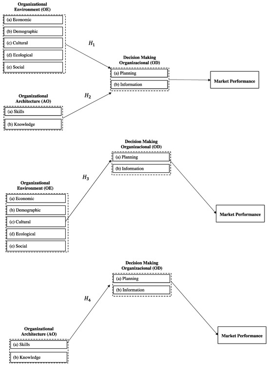 Amidst fierce global competition, rising costs, and rapid technological advances, organizations adopt innovative business environments to thrive [13]. These environments foster continuous innovation as a survival necessity [14,15]. Prior studies highlight the potential of OE, OA, and Decision Making in relation to MP [16,17,18,19,20]. Within this context, we posit Hypothesis H1: Organizational Environment has a positive association with Decision-Making, leading educational organizations to improve their Market Performance.