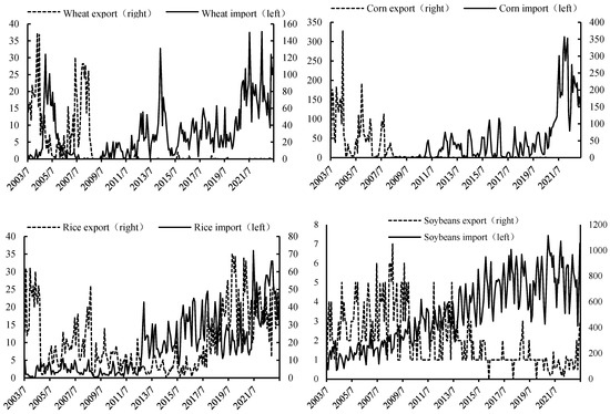 As can be seen from the trend of grain imports and exports (Figure 3), from July 2003 to December 2022, the import and export volumes of the four major staple grains, namely, wheat, maize, rice and soybeans, have been subject to a certain degree of volatility. Among them, wheat exports only rose sharply in 2003 and around 2008, with exports exceeding imports, while imports exceeded exports in all other years, and wheat imports peaked in 2004, 2014 and 2021. Changes in the import and export trade of maize can be divided into three stages: 2003~2007 is the trade surplus stage, where the export volume of maize exceeds the import volume, and the wave peak of the export volume occurs in 2004; 2008~2010 is the trade equilibrium stage, where the import and export volume of maize is flat; the trade surplus stage from 2011 to 2022, in which the import volume of maize exceeds the export volume, and the wave peaks in 2021 and shows more frequent and sharp fluctuations during the period from 2020 to 2022. On the other hand, rice shows a trade surplus from 2003 to 2008 and a trade deficit from 2011 to 2022, with imports peaking around 2021. Soybean, on the other hand, has been showing a trade deficit, with the maximum monthly export volume not exceeding 70,000 tons, and from July 2003 to December 2022, soybean imports grew from 2,177,900 tons to 10,550,000 tons, with a growth rate of 398.13%. Before 2011, food imports and exports still exist in a trade surplus. After 2011, the food trade entered the net import era, and the trade deficit is expanding.