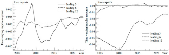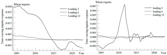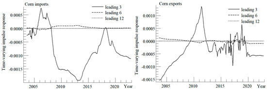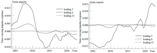 The time-varying impulse responses of the TVP-SV-VAR model can reflect the impact of U.S. trade policy uncertainty on China’s grain trade under different leading periods. In this paper, the number of leading periods is selected as 3, 6 and 12, corresponding to the impact characteristics of U.S. trade policy uncertainty on China’s grain trade in the short-term, medium-term and long-term phases, respectively, and the specific impulse responses can be referred to Figure 4, Figure 5, Figure 6 and Figure 7. As can be seen from the figure, the impact of U.S. trade policy uncertainty on China’s grain import and export volume is more evident in the leading three periods; with the lengthening of the leading period, the impact is gradually weakened; when the leading period is 12 periods, the impact intensity tends to be 0 gradually. It can be seen that the impact of U.S. trade policy uncertainty on China’s grain import and export volume does not have long-term sustainability, so the subsequent analysis mainly focuses on the leading three periods.