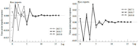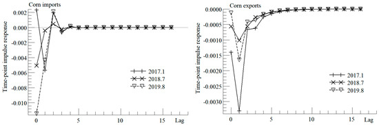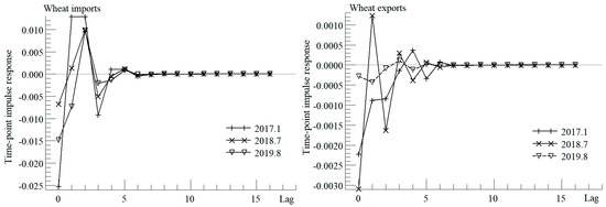 In terms of different periods, combining the time-varying impulse responses of the four-grain trade aggregates (Figure 8), the time-varying impulse responses of U.S. trade policy uncertainty on China’s grain imports and exports can be classified into two phases: