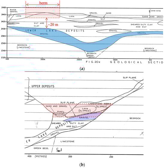 The Lar Dam is a 1300 m long and 105 m high embankment dam built between 1974 and 1982. The dam contains an almost central core of silt and sandy silt, and filter and transition zones on the upstream and downstream core sides. The dam’s shoulders of sandy gravel with slope inclinations range from 1:2.5 to 1:3.5. The cut-off is made up of a 32 m deep diaphragm wall in the alluvial foundation and a single-row grout curtain in the volcanic action and dolomite foundations. The usual functioning level is set at 2531 m above sea level [26]. The water level in the reservoir was growing slowly at the time, which was explained by the designer as the saturation of the void space in the soil formations several hundred meters thick beneath the reservoir. Also, the Lar Dam supplies 178 million m3/yr of water to the Jajrud basin, potable water to Tehran, and hydroelectric power [30]. The rock formations below the berm were further studied (Figure 2a,b). In the layout of the lava formation, it can be seen that the boundary of the lava flow is approximately at the crack location. The downward seepage occurs mainly through the lower lake deposits, assuming that the lava is comparable in impermeability. Hence, concentrated downward seepage occurs in the deposits and also at the boundary between the deposits and the lava, which becomes visible at the surface as an eroded line [29].