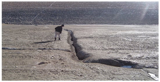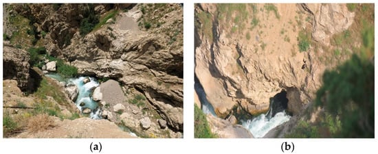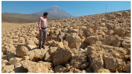 At the beginning of the water extraction, the water leakage ranged between 3 and 13 (m3/s). The dam’s right and left abutments were built on a limestone formation and alluvial deposits (generated from a lava layer originating from the Damavand volcano), respectively. Reduction in the lake water level has been caused by karst channels in the limestone structure [30]. Two different water escape locations are depicted in Figure 4.