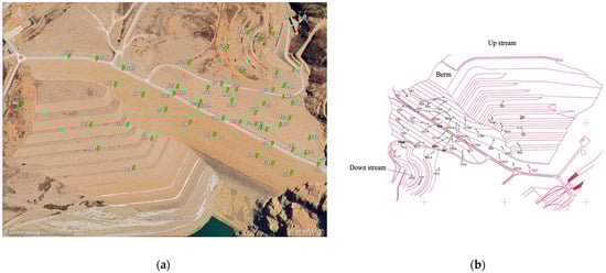 The terrestrial surveying network over the Lar Dam was set up on and in proximity to the dam, and three measurements were made in 1992, 2013, and 2019. It should be noted that using an extensive terrestrial surveying network increases the measurement accuracy [30]. The geodetic points’ locations (on the dam network) are shown in Figure 7.
